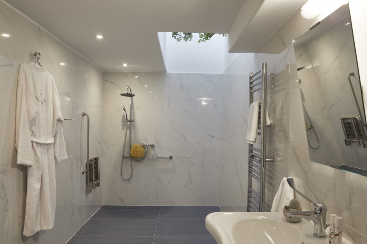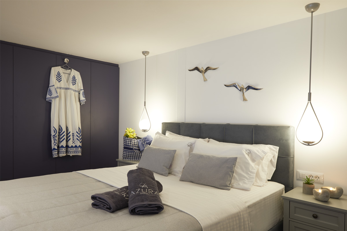 The main concern was the creation of an inclusive accommodation that would enable people with disabilities, meet their needs and provide them with a high standard experience by the sea. With inclusion in mind and without affecting the aesthetics of Azura Sea, the accommodation features an outdoor lift, tactile walking stick guide tiles, wide entrances without steps, special cupboards without knobs and a particularly neat bathroom with a special place for the walk-in shower, adjustable wash basin, suitable waste basket, auxiliary handles and window operated by remote control.
